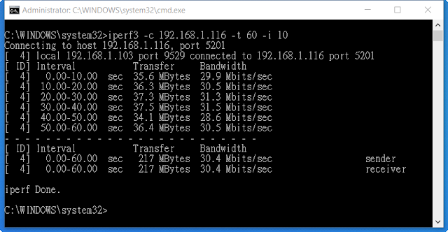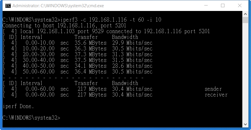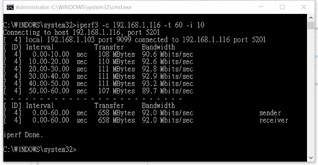 iperf3 -c 192.168.1.116 -t 60 -i 10