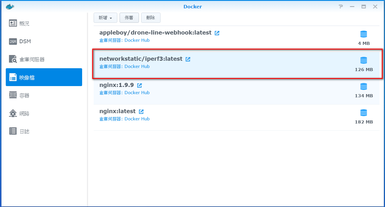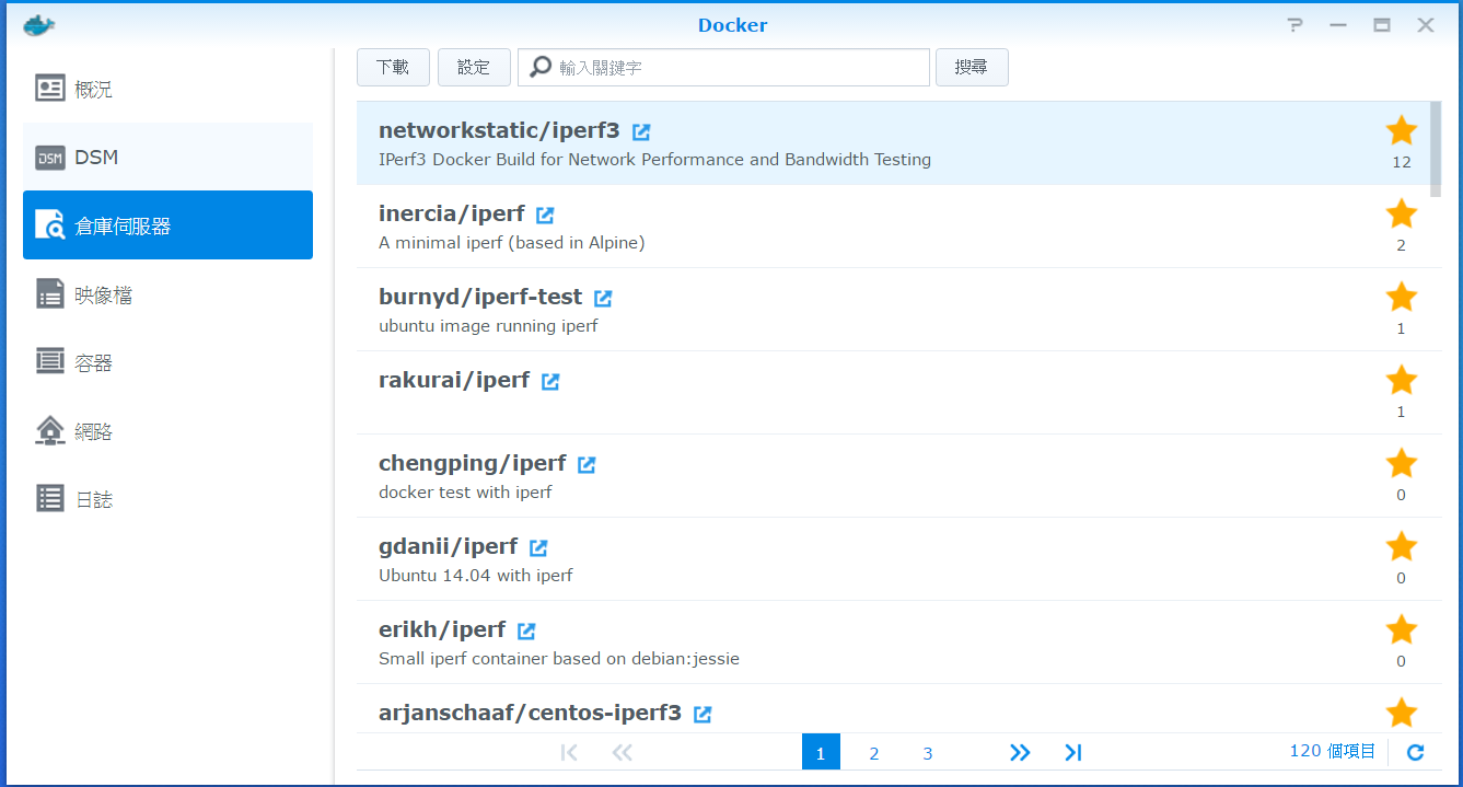 開啟Docker後,到倉庫伺服器頁面→搜尋iperf→點選networkstatic/iperf3→下載