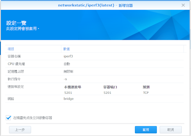 回到新增容器的頁面後按下一步,之後檢查設定無誤後點選套用