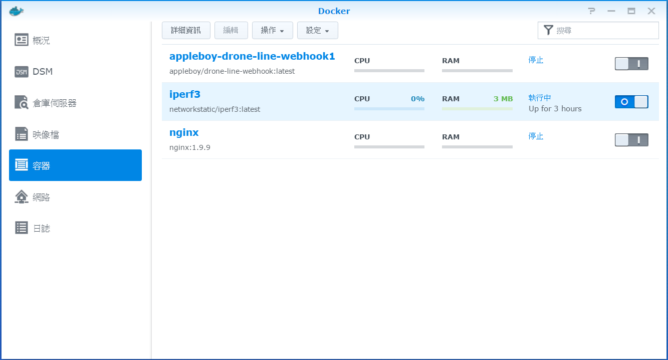 此時回到Docker主介面,切換到容器頁籤就可以看到iperf的容器正在運行