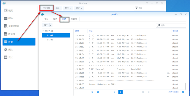 最後如果想要看到iperf server端的顯示,可以在Docker→容器→詳細資訊→日誌裡查看