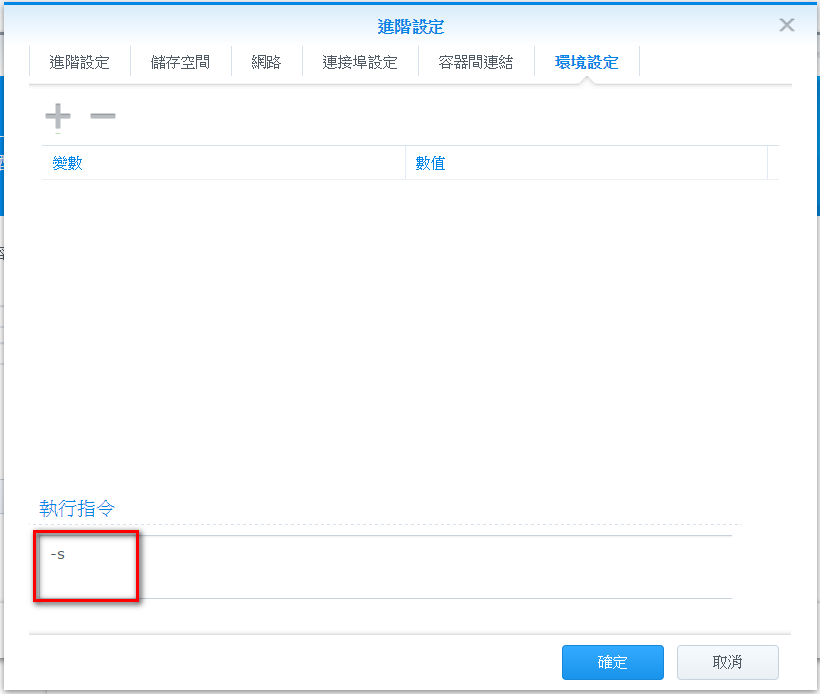 切換到環境設定,在底下執行指令裡打上-s後按下確定按鈕