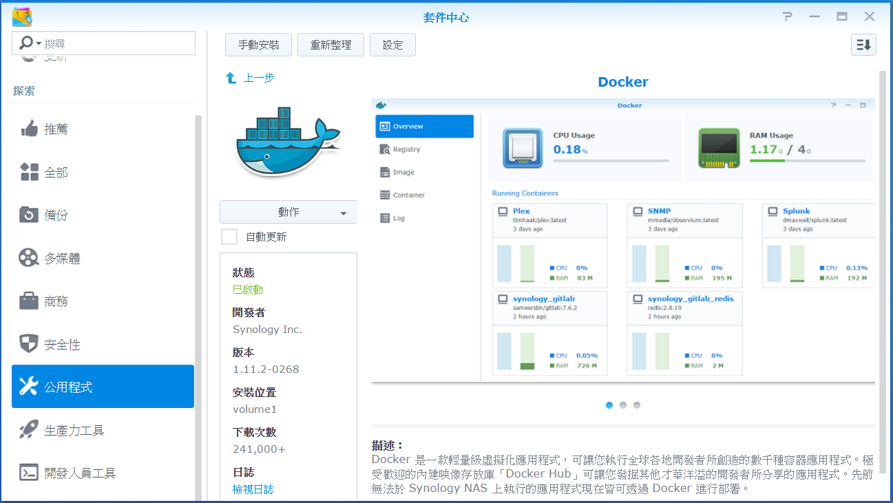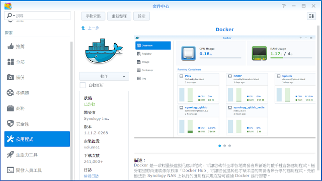 有人提供docker化後的iperf給人使用。首先先到DSM中的套件中心安裝Docker