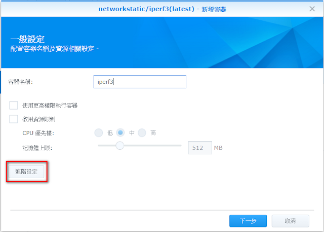 接下來設定容器名稱,自己取個好記的名字即可,之後點進階設定