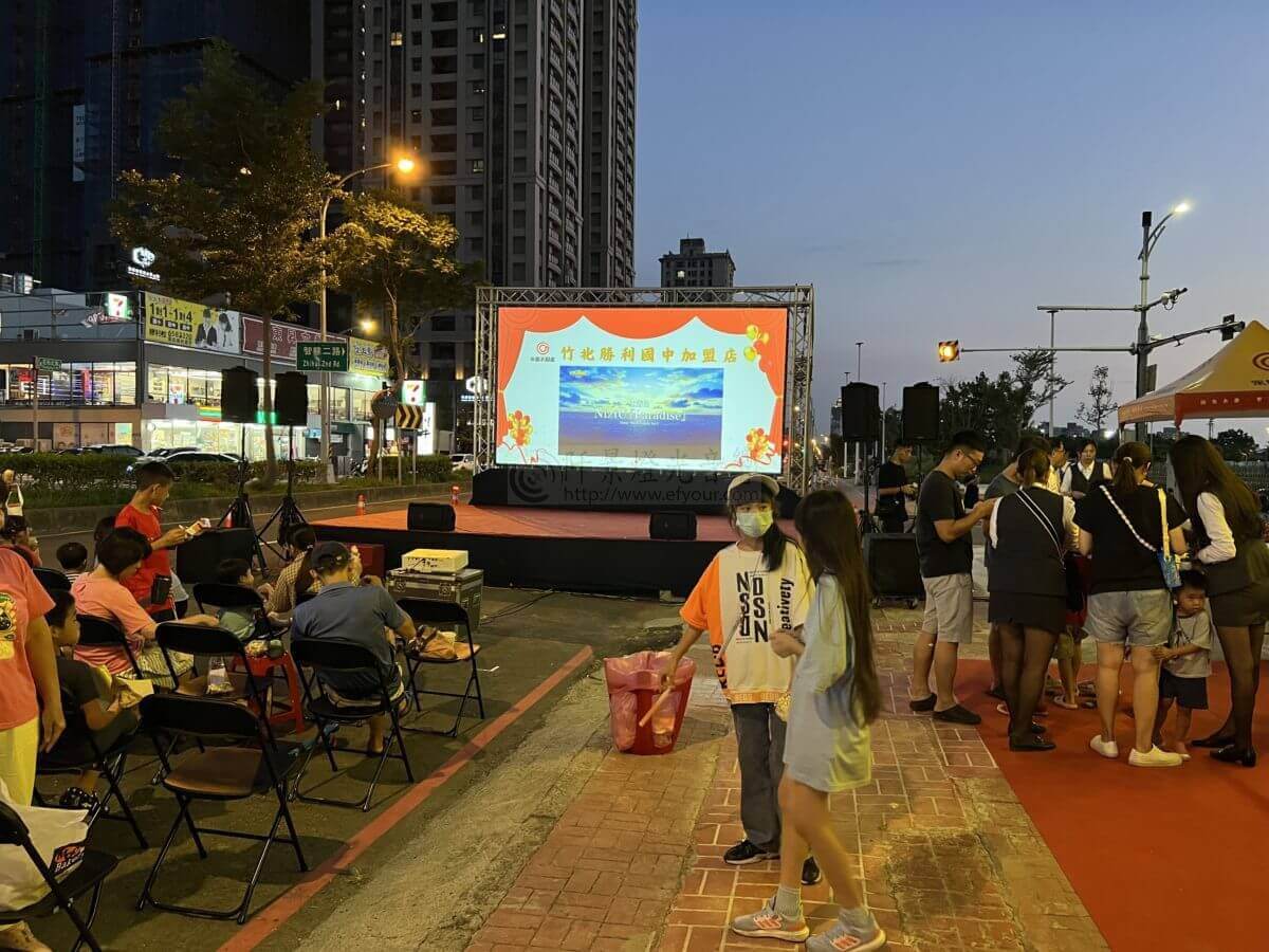 永慶房屋在竹北勝利國中店的開幕式,人群聚集,熱鬧非凡。突然,一部路上電影院的大螢幕升起,播放著精彩的影片,為這個特別的日子增添了不少樂趣。這不僅僅是一場開幕,這是一場視覺盛宴,一場社區的慶典!